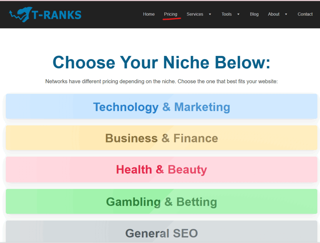 Go to the T-RANKS Pricing Page. At the top menu, click “Pricing.” You’ll see a page with five colored buttons for different niches: Technology & Marketing, Business & Finance, Health & Beauty, Gambling & Betting, and General SEO.