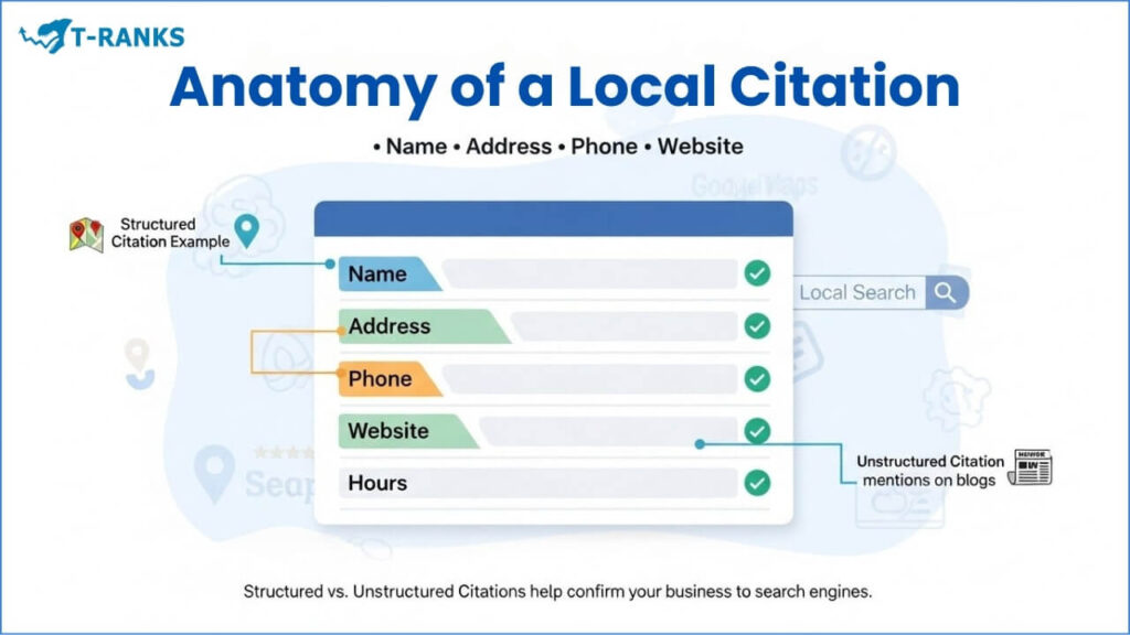 A local citation is any online mention of a business’s core details: Name, Address, and Phone number (NAP). Many citations also include extra information such as a website URL, business hours, categories, reviews, or photos. Together, these details act as digital proof that confirms a business’s legitimacy and location.