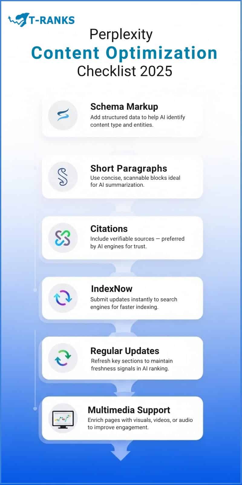 Perplexity favors organized, scannable content. Use subheadings, bullet lists, and schema markup (FAQ, How-To, or Article). Readable formatting helps the AI extract key information correctly—structure equals visibility in generative search.